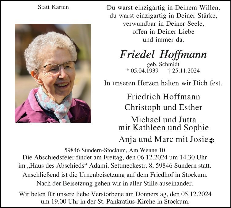 in dieser Zeit des Schmerzes wünschen wir Ihnen Kraft, den Verlust im Kreise Ihrer Liebsten zu verarbeiten. Als Zeichen unserer Anteilnahme und des Gedenkens entzünden wir dieses erste Licht. Möge diese Gedenkseite Ihnen helfen, Erinnerungen zu teilen und so das Andenken gemeinsam wachzuhalten.